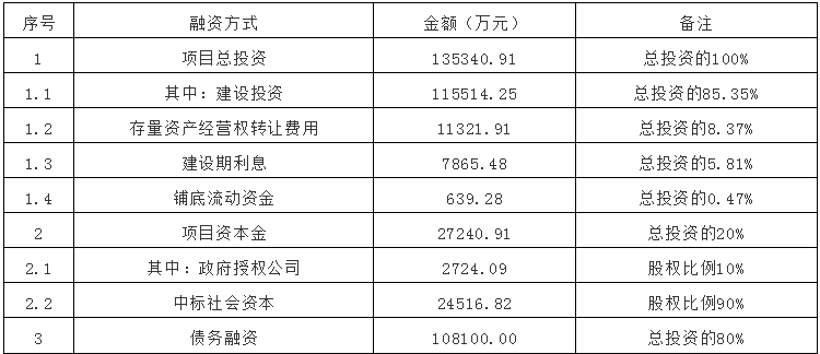 《可研報告》總投資估算139817.25萬元,其中工程費用89652.99萬元(其中建安工程費82554.80萬元、設(shè)備購置費7098.19萬元),工程建設(shè)其他費用22293.17萬元(其中土地使用費和補償費10000.00萬元,勘察設(shè)計費3065.76萬元,其他9227.41萬元),基本預(yù)備費8155.69萬元,建設(shè)期利息7754.21萬元,存量資產(chǎn)經(jīng)營權(quán)轉(zhuǎn)讓費用11321.91萬元,鋪底流動資金639.28萬元。